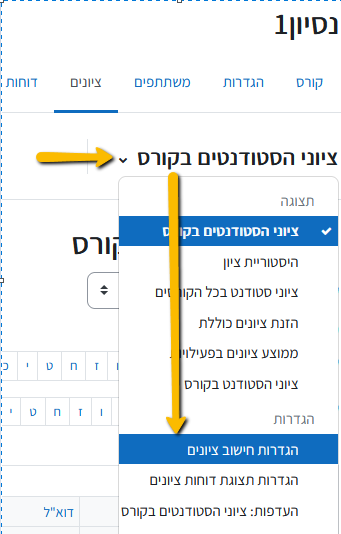 גשו לרשימה הגולשת -> "ציוני הסטודנטים בקורס" - > בחרו ב"הגדרות חישוב ציונים":