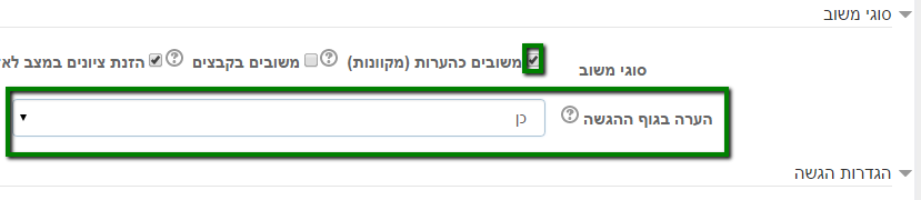 2) בהגדרות המטלה: ניתן לבחור ב"סוגי משוב" -> "משובים כהערות (מקוונות)" וב"הערה בגוף ההגשה" -> "כן"