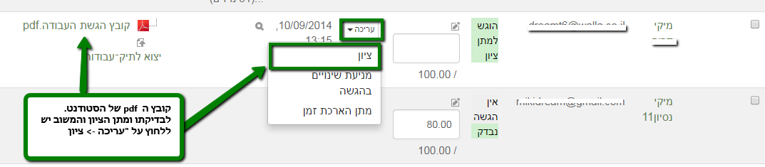 1) לאחר הגשת קובץ ה pdf ע"י הסטודנט ניגשים לתצוגת הגשות המטלה (הצגת / מתן ציונים להגשות) מוודאים שהקובץ מופיע ולוחצים על -> עריכה-> ציון לצורך בדיקת ההגשה ומתן ציון\משוב.