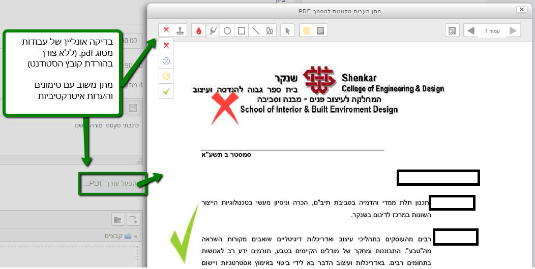 משוב אינטרקטיבי של קובץ pdf - הגשת קובץ Pdf ע"י הסטודנט.. המרצה יכול להגיב על גבי הקובץ ללא שמירת הקובץ במחשב שלו.