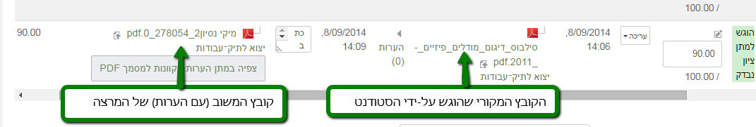 3) בחזרה לעמוד "הצגת / מתן ציונים להגשות" ניתן לראות את ההגשת ה pdf המקורית של הסטודנט מול קוובץ ה pdf עם ההערות המקוונות של המורה: