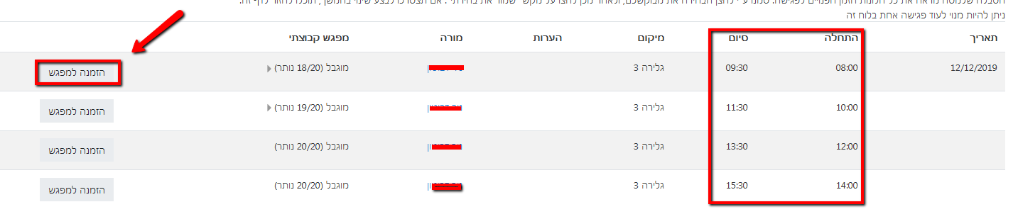 6) הצד של הסטודנט לבחירת המפגש. על הסטודנט לבחור את המועד הרצוי וללחוץ על "הזמנה למפגש":