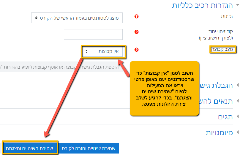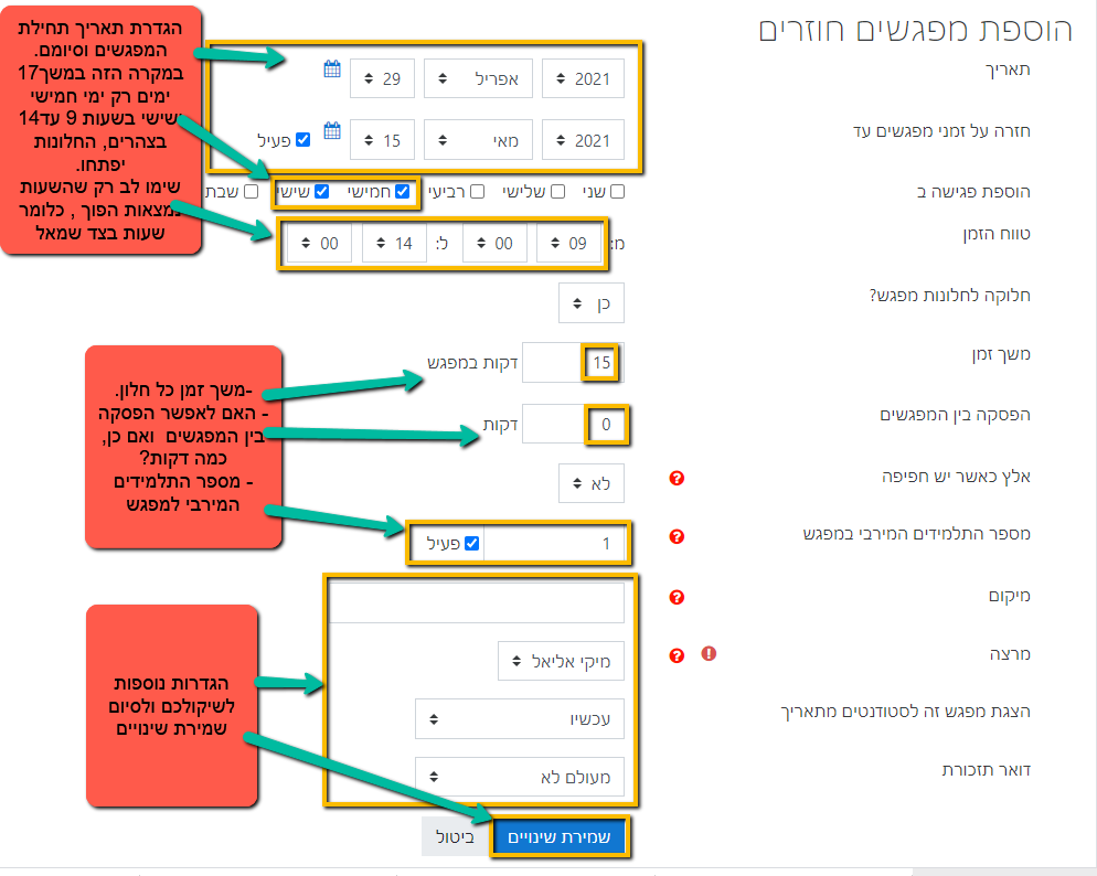 שלב 2- הגדרת המפגשים לפי מועדים (ימים, שעות), משך זמן, מספר מירבי של תלמידים, מיקום ותזכורות: