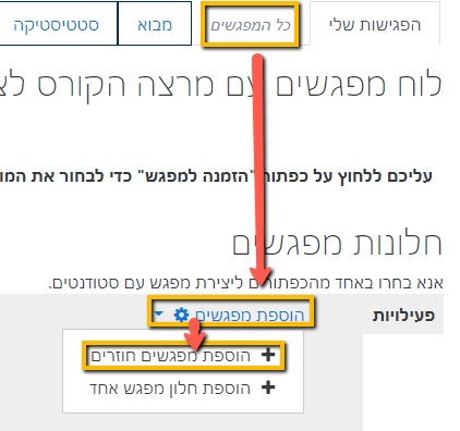 1) הוספת פעילות בשם "לוח מפגשים" - יש ללחוץ על כפתור הפעלת עריכה ולאחר מכן "הוספת משאב או פעילות" ולבחור בפעילות "לוח מפגשים":