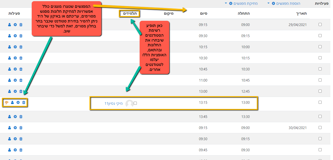 5)  רשימת המפגשים כולל הסטודנטים שבחרו. בנוסף,  אפשרויות למחיקה, עריכה, או ביטול מפגשים קיימים: