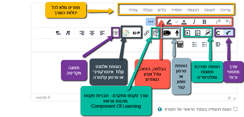 בתמונה הבאה קיים הסבר ראשוני על האייקונים (צלמיות) החדשים הנמצאים בעריכת טקסט ברחבי האתר במצב הגדרות שונות: