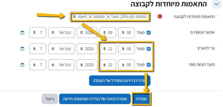 יש לבחור ב "התאמוה מיוחדות לקבוצה" את קבוצת תוספת הזמן הרלוונטית ,